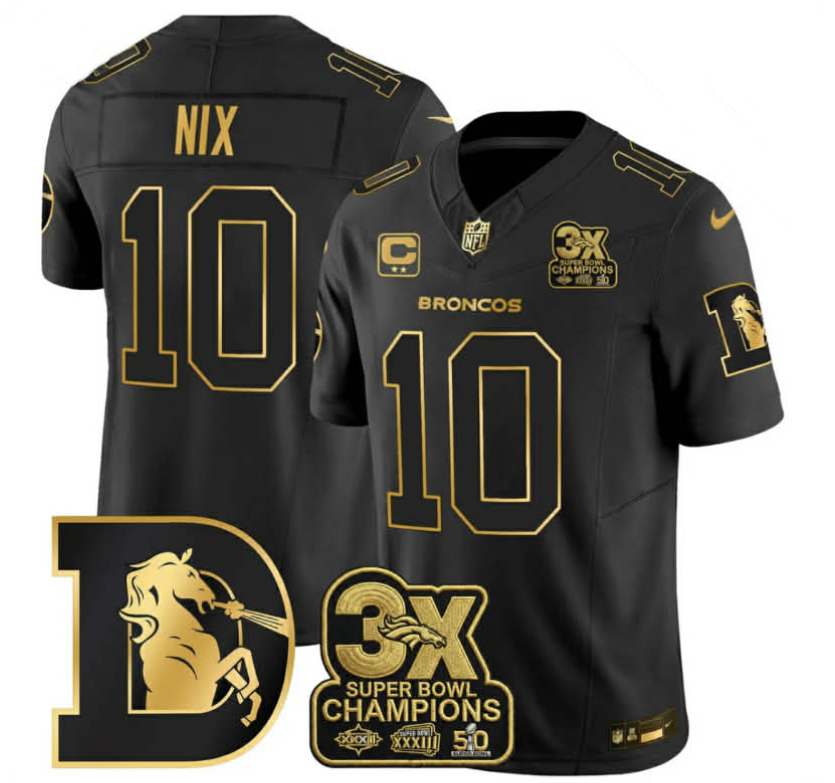 Men’s Denver Broncos #10 Bo Nix Black With C/3X Super Bowl Champs Patch 2024 F.U.S.E. Vapor Limited Stitched Football Jersey