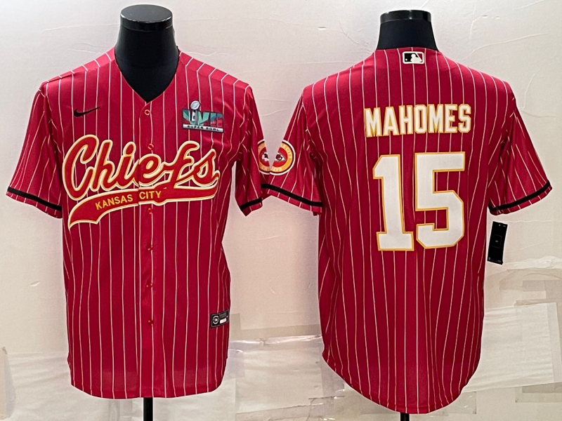 Men’s Kansas City Chiefs #15 Patrick Mahomes Red With Super Bowl LVII Patch Baseball Jersey