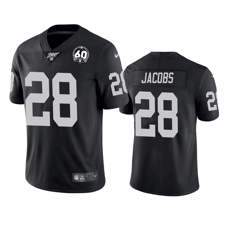 Men’s Oakland Raiders #28 Josh Jacobs Black 100th Season With 60 Patch Vapor Limited Stitched Jersey