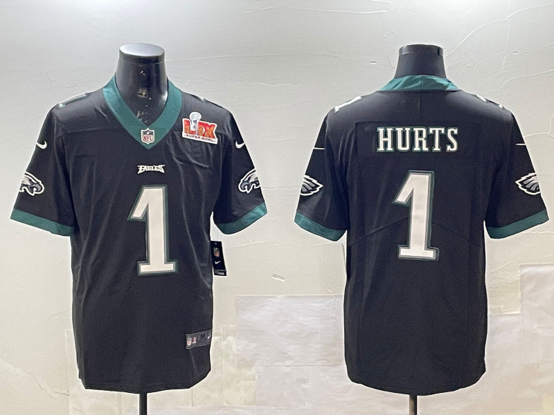 Men’s Philadelphia Eagles #1 Jalen Hurts Black 2025 Super Bowl LIX Patch Fashion Vapor Jersey